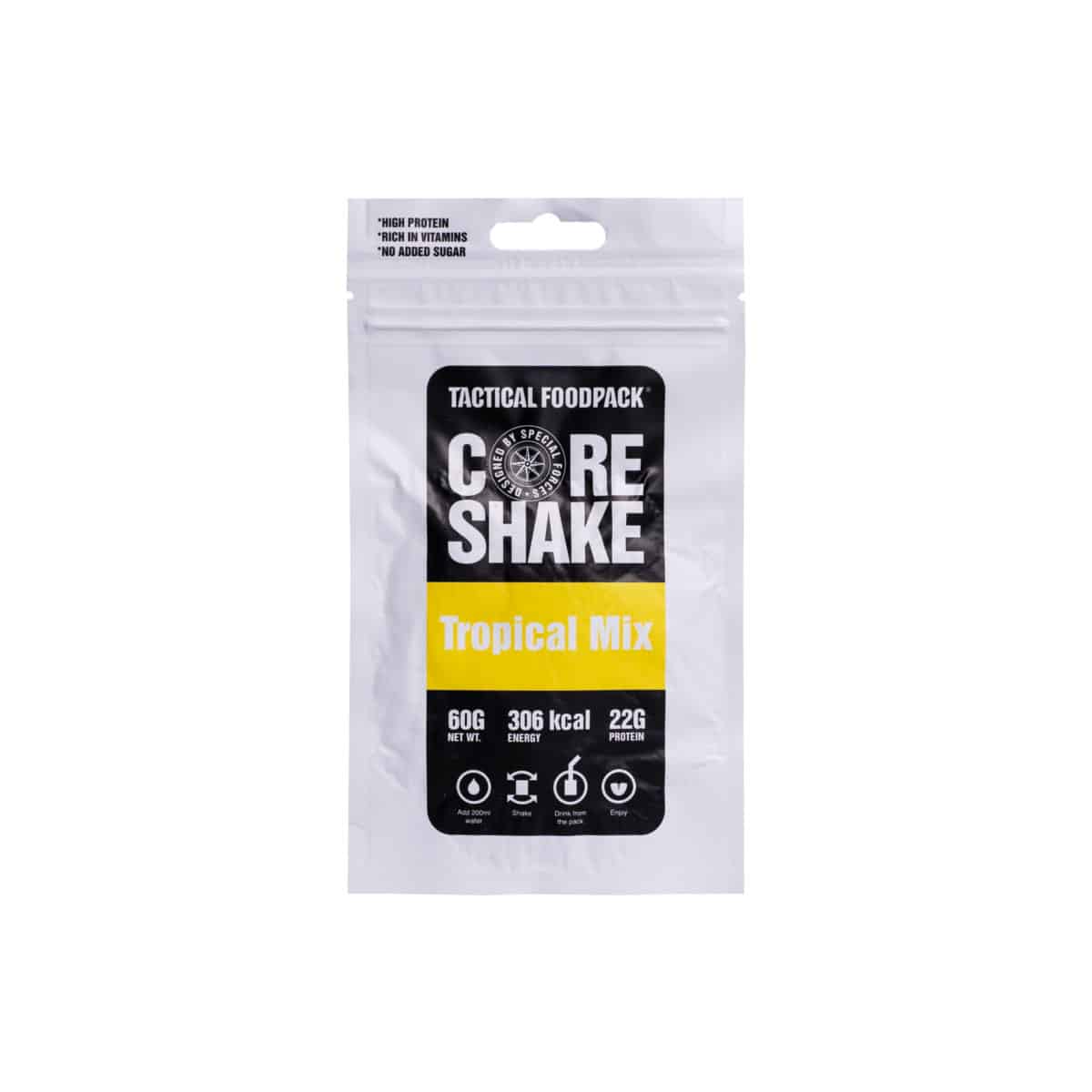 Der Core Shake Tropical Mix von Tactical Foodpack ist ein nährstoffreicher, gefriergetrockneter Superfood-Smoothie mit Bananen und Ananas, ideal für Sportler, Outdoor-Abenteurer und Muskelaufbau-Fans. Jeder 60 g-Portion liefert rund 306 kcal, darunter 22,5 g hochwertiges Kasein-Protein (22 %), MCT-Öl für langanhaltende Energie sowie natürliche Vitamine – ganz ohne zugesetzten Zucker. Durch die Gefriertrocknung bleiben Nährstoffe und Geschmack nahezu vollständig erhalten. Die Zubereitung könnte kaum einfacher sein: kaltes Wasser einfüllen, shaken, direkt aus dem Beutel genießen.