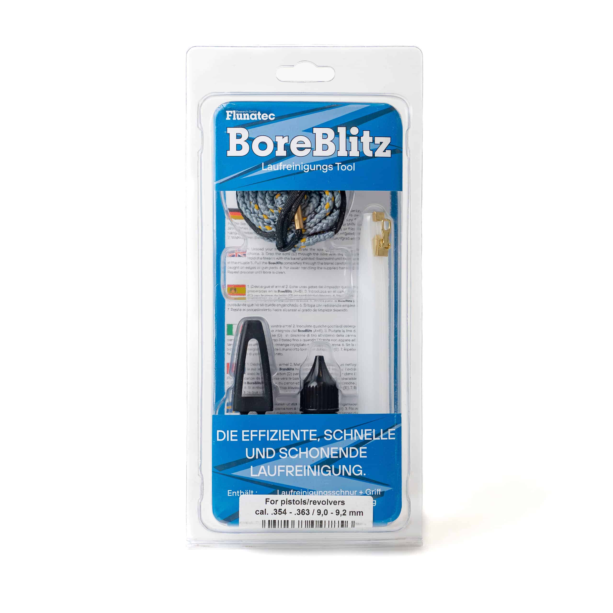 Ο καθαριστής κάννης BoreBlitz για πιστόλια διαμετρήματος .354-.363 / 9 mm – 9,2 mm είναι η ιδανική λύση για γρήγορο και σχολαστικό καθαρισμό της κάννης του πιστολιού σας – χωρίς εργαλεία. Εξοπλισμένο με το καινοτόμο σύστημα δύο θαλάμων, το BoreBlitz αφαιρεί αξιόπιστα υπολείμματα μπαρουτιού, ρύπους και λάδια και στεγνώνει ταυτόχρονα την κάννη με ένα μόνο πέρασμα. Το εύκαμπτο νάιλον κορδόνι με ενσωματωμένο βάρος εξασφαλίζει εύκολη εισαγωγή, ενώ η βαθμονομημένη με ακρίβεια επιφάνεια καθαρισμού προσφέρει μέγιστη αποτελεσματικότητα με πλήρη προστασία της κάννης. Ιδανικό για προπόνηση, αγώνες ή καθημερινή χρήση.