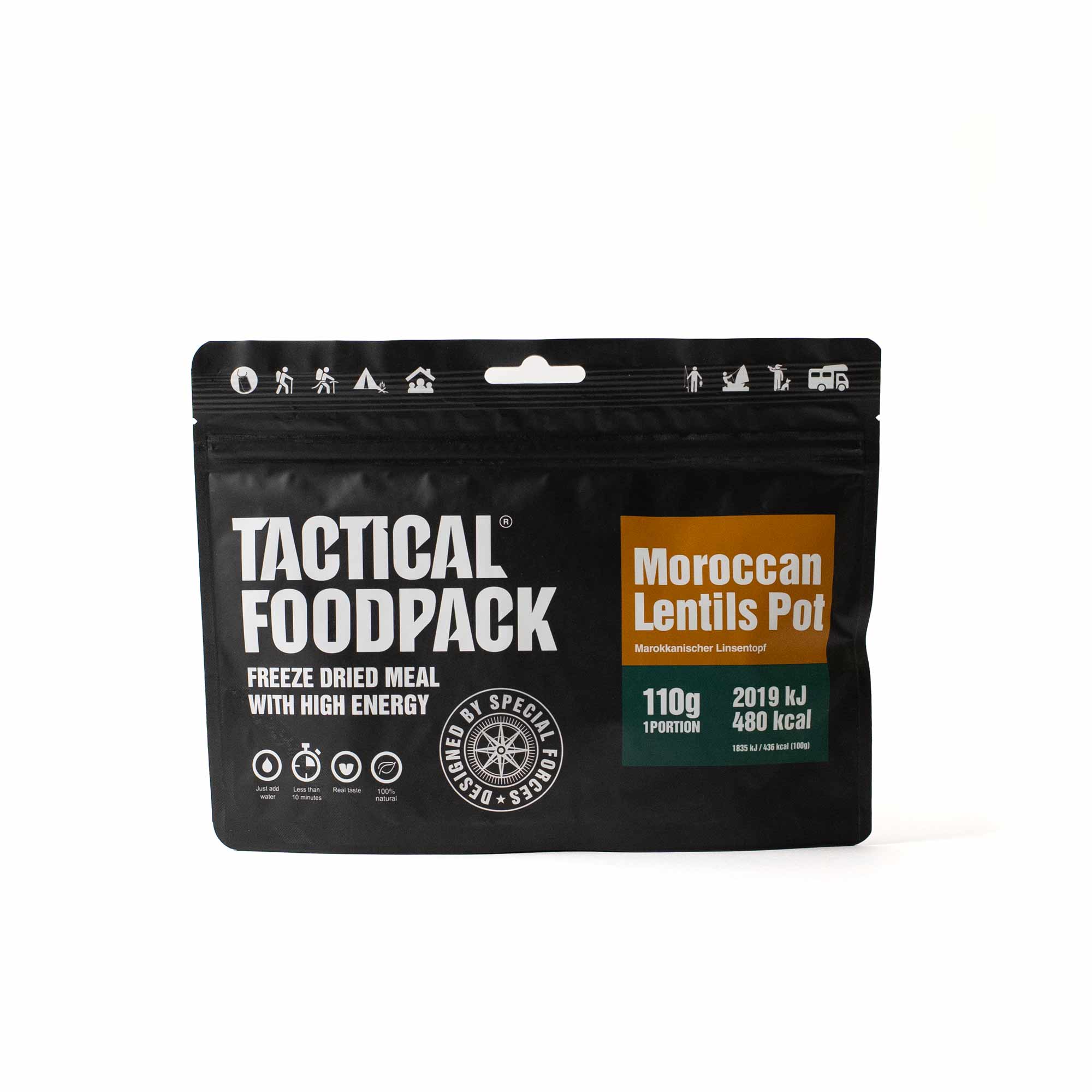 Η μαροκινή φακή στιφάδο είναι ένα υγιεινό, vegan γεύμα για εν κινήσει, το οποίο έχει αναπτυχθεί ειδικά για χρήση σε εξωτερικούς χώρους, για προετοιμασία σε περίπτωση κρίσης ή για ένα γρήγορο, θρεπτικό σνακ μεταξύ των γευμάτων. Με ξηρό βάρος 110 g, το πιάτο αποδίδει περίπου 410 g χορταστικού στιφάδο με ανατολίτικο άρωμα μετά την προετοιμασία. Ο κατάλογος των συστατικών είναι σαφής και φυσικός: κόκκινες φακές, ρύζι, γλυκοπατάτες, καρότα, πιπεριές, σπανάκι, κρεμμύδια, κραμβέλαιο και ένα ισορροπημένο μείγμα μπαχαρικών όπως κύμινο, καπνιστή πάπρικα σε σκόνη, κουρκουμά και κανέλα. Χωρίς συντηρητικά και χωρίς γλουτένη και λακτόζη, αυτό το πιάτο έχει μεγάλη διάρκεια ζωής τουλάχιστον μέχρι τον Ιούλιο του 2030 – ιδανικό για προμήθειες έκτακτης ανάγκης ή ως πρακτικό γεύμα σε ένα σακίδιο.