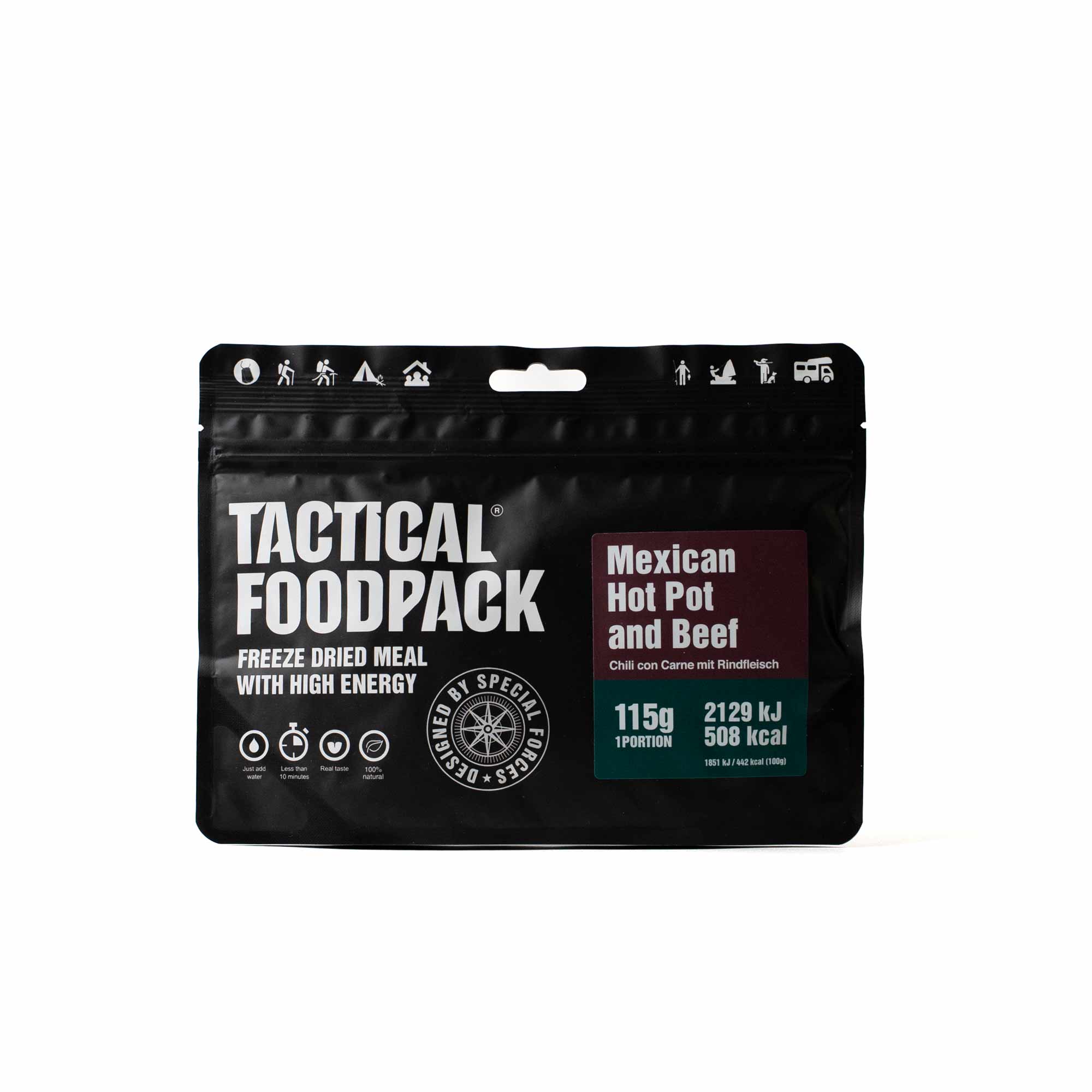 Το “Mexican Hot Pot and Beef” (chilli con carne) από το Tactical Foodpack είναι ένα πλούσιο και πικάντικο μείγμα από ρύζι, μοσχαρίσιο κιμά (15%), ψιλοκομμένες ντομάτες, κόκκινα φασόλια, καρότα, κρεμμύδια, κραμβέλαιο και αρωματικά μπαχαρικά. Χάρη στην παρασκευή με ψυχρή ξήρανση, διατηρείται η πλήρης γεύση. Με ξηρή περιεκτικότητα 115 g, η προσθήκη νερού οδηγεί σε ένα πλούσιο, πρωτεϊνούχο πιάτο με 508 kcal. Η συσκευασία είναι ιδανική για χρήση σε εξωτερικούς χώρους, για ετοιμότητα σε περίπτωση κρίσης και για ταξίδια – απλή, θρεπτική και μακράς διαρκείας (τουλάχιστον μέχρι τον Φεβρουάριο του 2030)