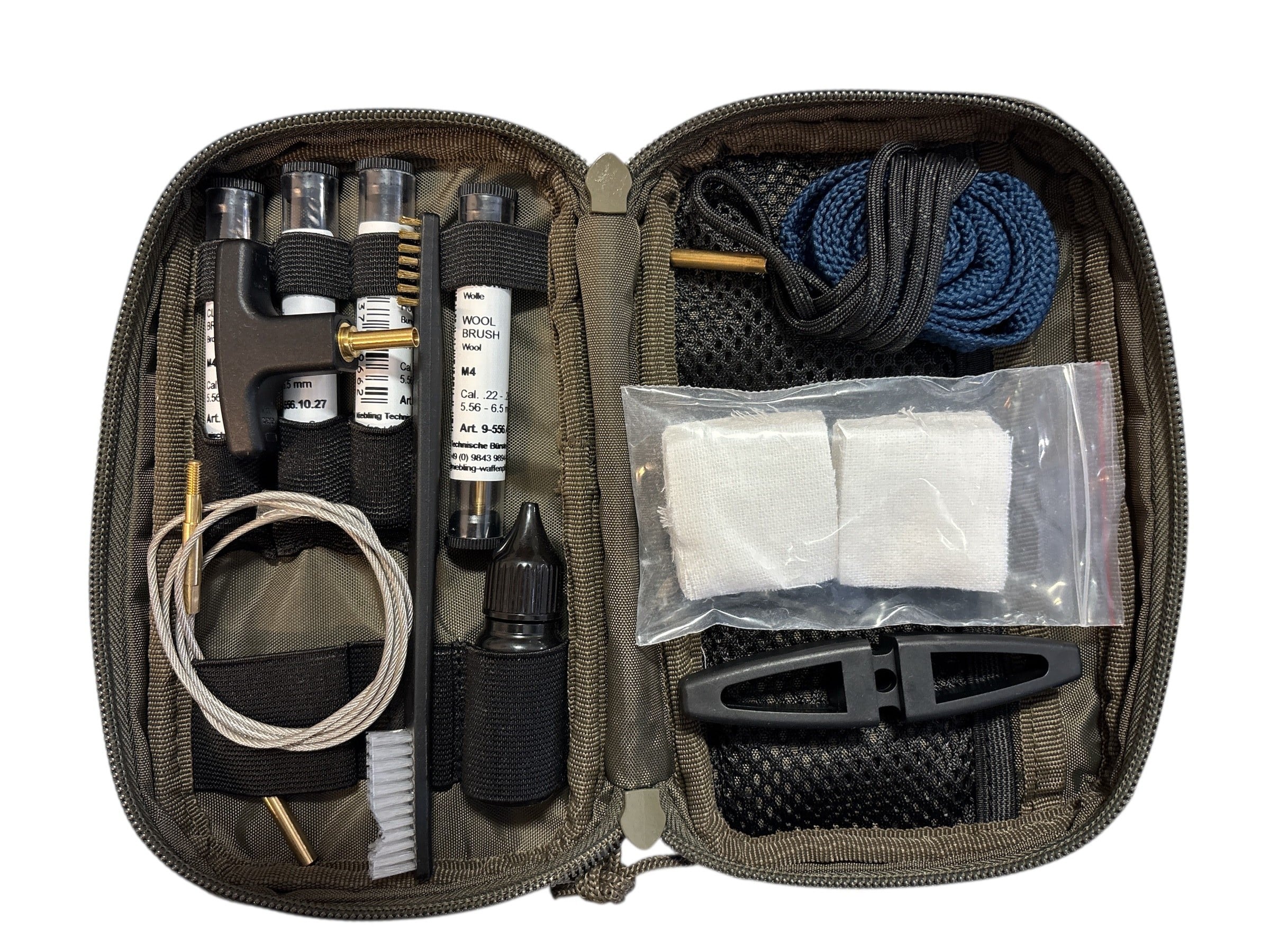 Το Σετ Φροντίδας Πεδίου Fluna (11 τεμάχια) περιέχει όλα τα απαραίτητα εργαλεία καθαρισμού για το ταξίδι. Διατίθεται για πιστόλια διαμετρήματος 9x19mm και .45ACP καθώς και για μακρύκαννα όπλα, ειδικά για συστήματα AR-15 διαμετρήματος .223Rem. Η πράσινη-καφέ τακτική τσάντα μπορεί να προσαρτηθεί τέλεια σε διάφορους εξοπλισμούς.