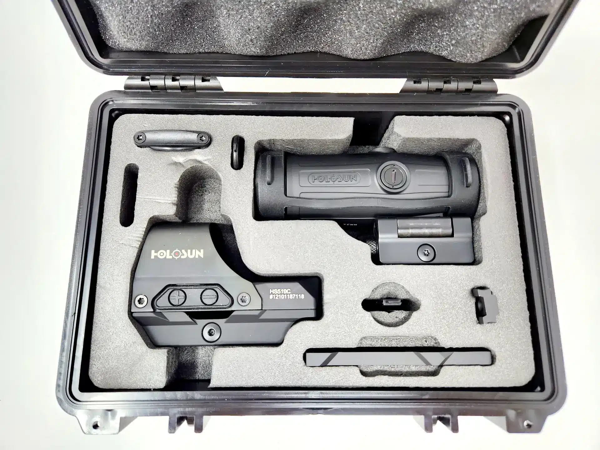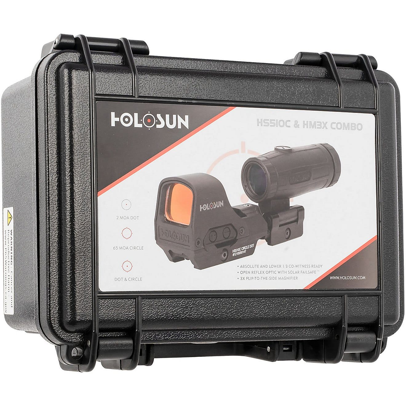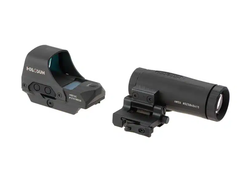 Το Holosun HS510C Solar Red Circle Dot Sight Combo με HM3X είναι ένα αρθρωτό οπτικό σύστημα στόχου που συνδυάζει έναν ανοιχτό αντανακλαστικό κολιμάτορα κόκκινης κουκκίδας (HS510C Solar) με ενσωματωμένη ηλιακή ασφάλεια αστοχίας και τριπλή μεγέθυνση (HM3X). Το HS510C προσφέρει μια ανακλινόμενη κουκκίδα 2-MOA μέσα σε δακτύλιο 65-MOA, έξι φωτεινότητες σκόπευσης ημέρας και δύο νυχτερινής σκόπευσης και τεχνολογία Shake-Awake για αυτόματη ενεργοποίηση σε κίνηση. Η ηλιακή κυψέλη παρατείνει τη διάρκεια ζωής της μπαταρίας και παρέχει σταθερή φωτεινότητα. Ο μεγεθυντικός φακός HM3X μπορεί να αναδιπλωθεί στο πλάι όταν δεν χρησιμοποιείται και επεκτείνει το οπτικό πεδίο σε μεσαίες αποστάσεις (έως περίπου 300 μέτρα). Μπορεί να τοποθετηθεί σε ράγες Weaver ή Picatinny, ιδανικός για παραλλαγές AR-15, HK MP5, SIG Sauer MPX ή προσαρμογείς Glock για πιστόλια. Το αντικραδασμικό, αδιάβροχο περίβλημα είναι απαλλαγμένο από σκόνη και ομίχλη. Με συνολικό βάρος περίπου 400 g, ο συνδυασμός είναι στιβαρός και μπορεί να χρησιμοποιηθεί τόσο για γρήγορη απόκτηση στόχου όσο και για ακριβή σκοποβολή.