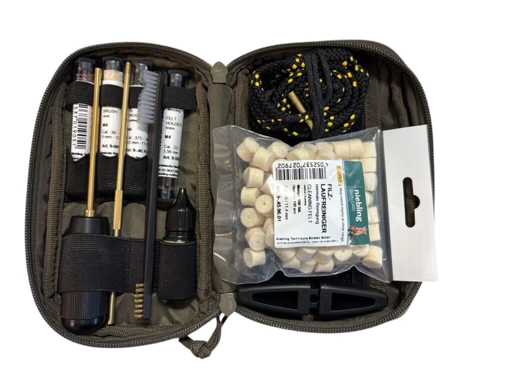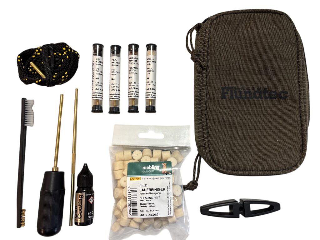 The FLUNA FIELD CARE SET .45 ACP is the ideal complete cleaning set for anyone who wants to take optimum care of their large-caliber handgun while on the move. Specially designed for the .45 ACP caliber, the set contains everything you need for fast, effective and professional gun cleaning: a robust, 2-piece cleaning rod, suitable felt cleaners, the Bore Blitz barrel cleaner and the tried-and-tested Fluna GunCoating for long-lasting protection and lubrication. Compactly packed, always ready to hand – perfect for the shooting range, use or transportation.