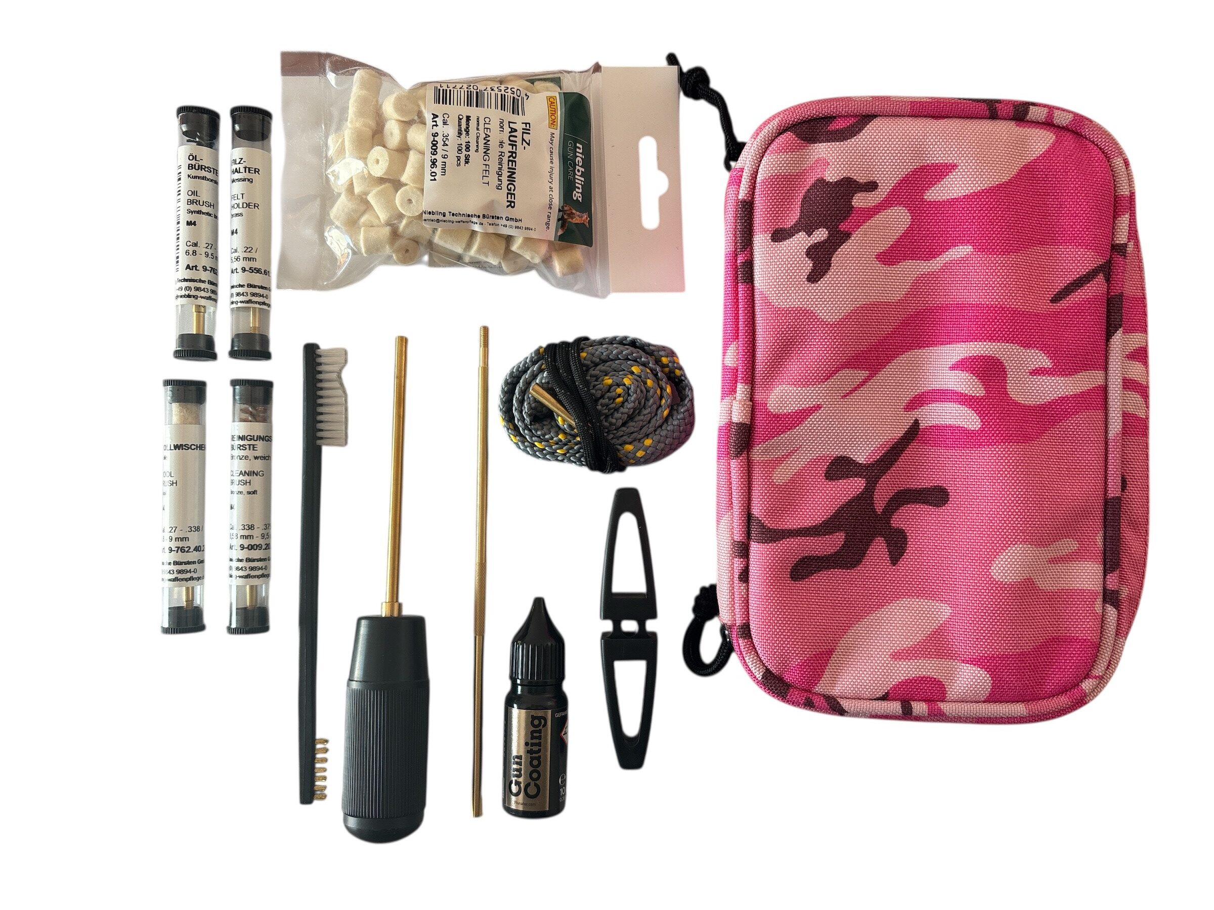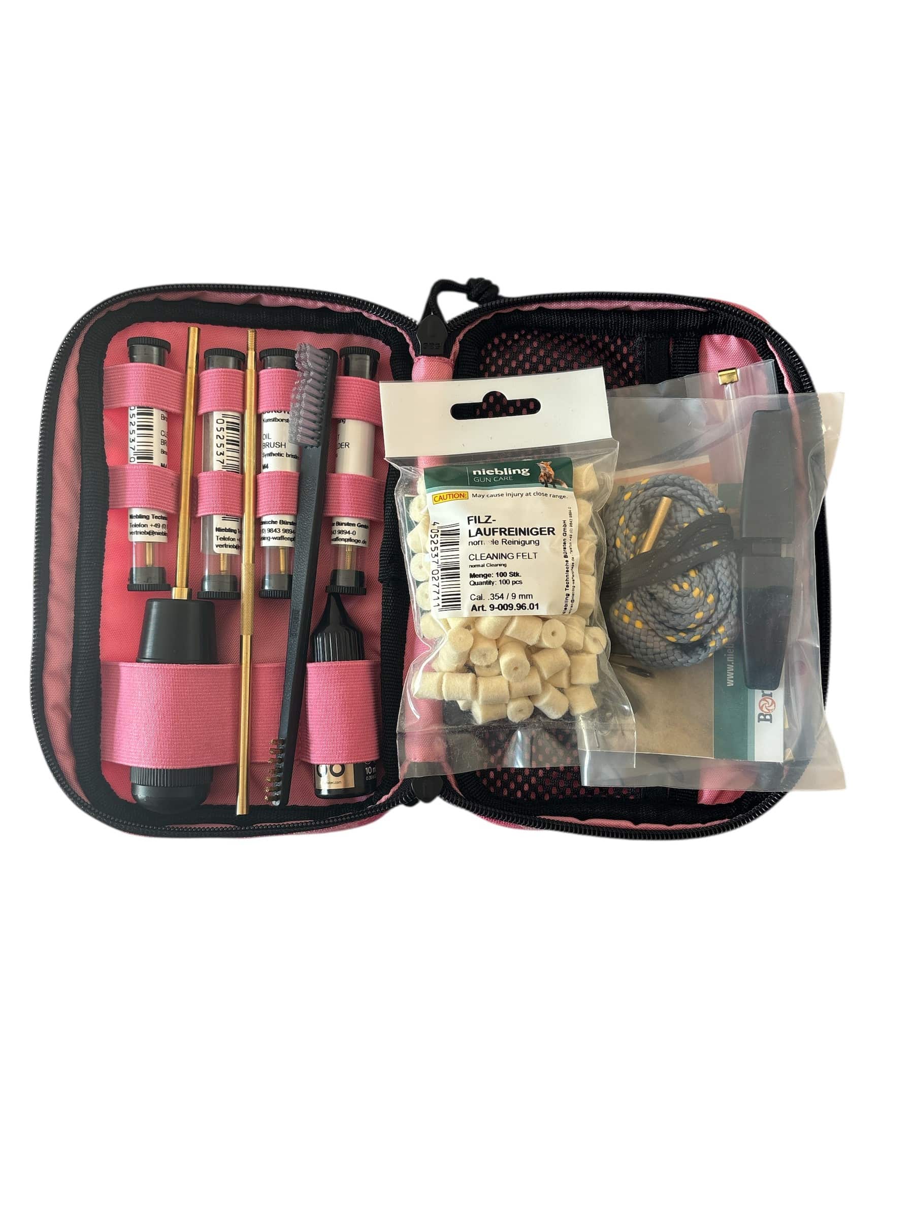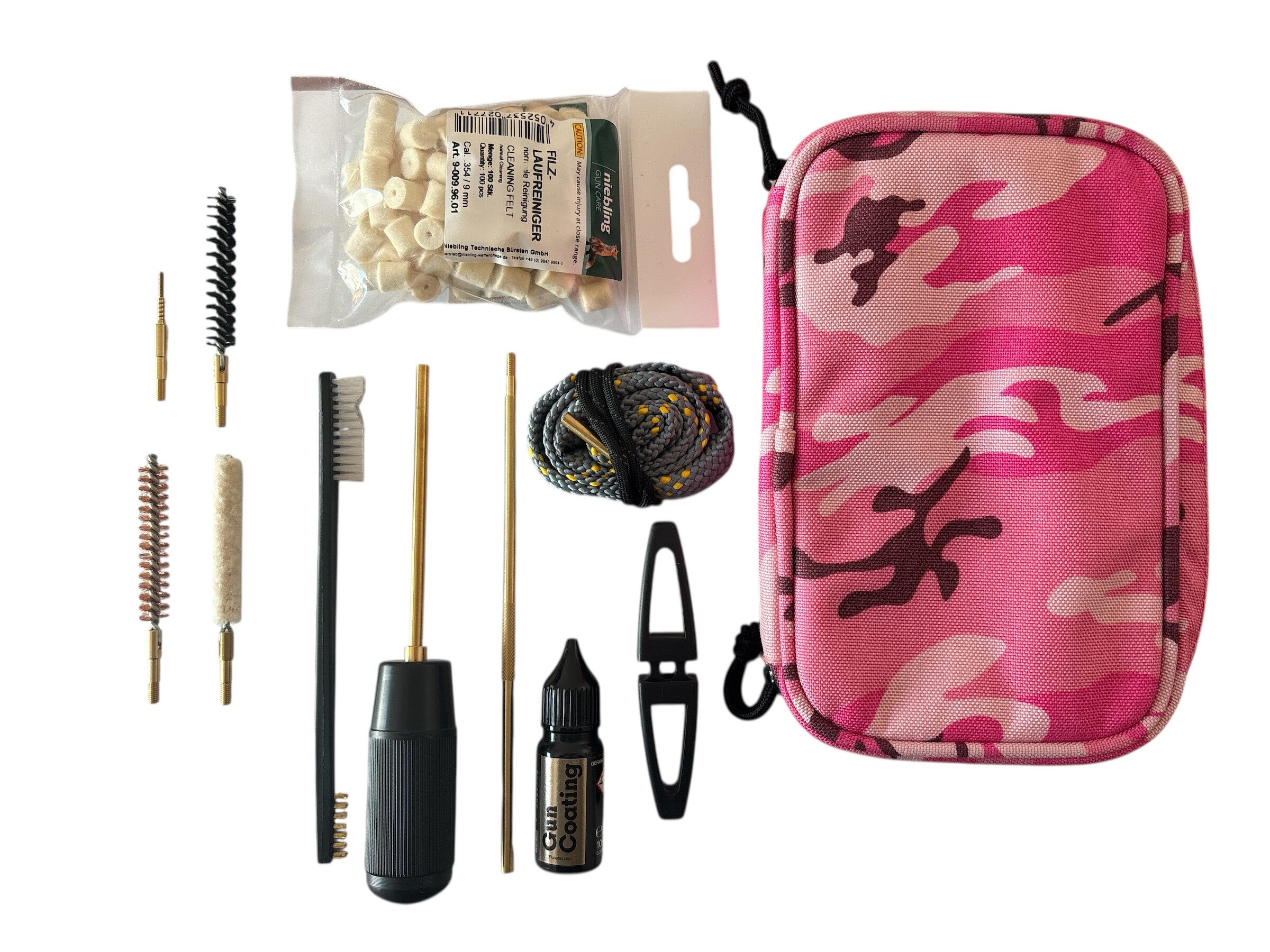 The Fluna Field Care Set 9mm – a compact, professional cleaning and maintenance set especially for 9mm handguns. Ideal for use in the field, during shooting training or for quick maintenance: handy storage bag with cleaning rod, brushes, felt plug, lubricant, Bore Blitz barrel cleaning cord and practical tools for routine checks.
