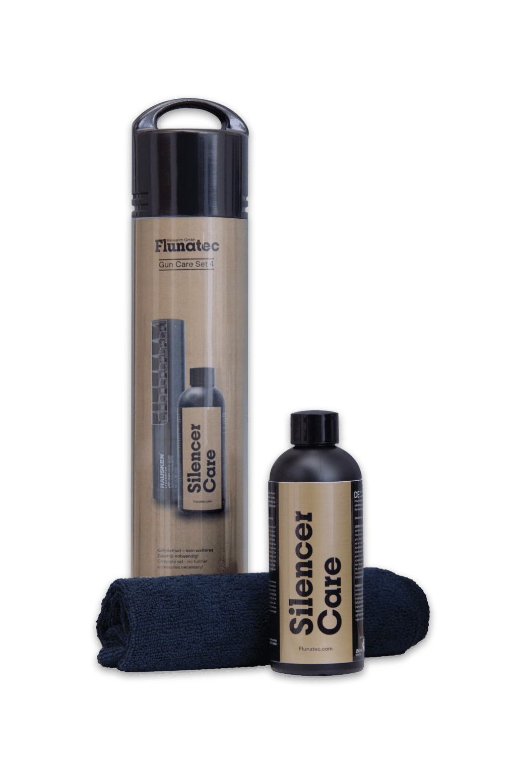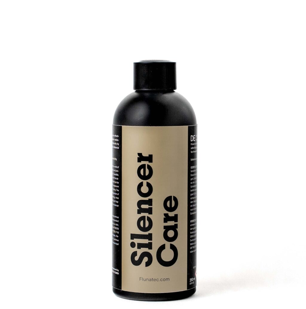 In future, use Fluna SDR, the special cleaner and degreaser for all silencers, to clean your silencer automatically. Fluna SDR automatically cleans metal surfaces of powder smoke and all combustion residues. Simply prepare the cleaning solution in the bottle included in the set, insert the silencer disassembled or not and you will achieve the desired result after 30 minutes to two hours without any further effort.