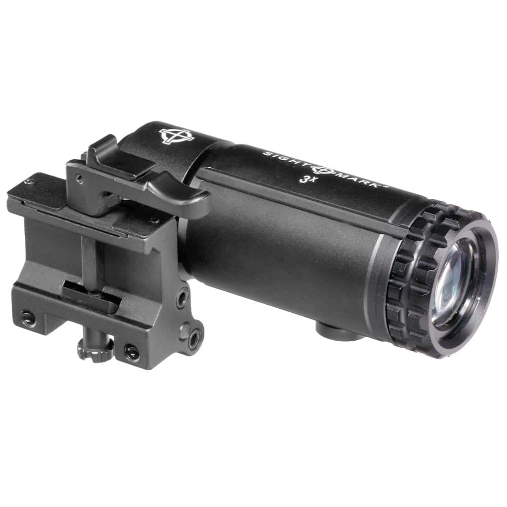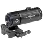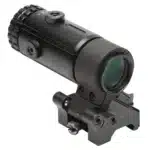 The Sightmark T-5 Magnifier LQD Flip-to-Side is a compact observation attachment with a fixed 5x magnification factor and a 32mm objective lens designed specifically for short-range red dot sights. The magnifier is mounted on the Weaver or Picatinny rail profile via a quick-release LQD holder and can be folded to the side when not in use to allow quick switching between magnification and normal view. Trito-coated lenses provide high light transmission and clear image definition, while the anodized aluminum housing is shockproof, waterproof and fogproof. Target acquisition is ideal for AR-15 variants such as the Colt M4, the SIG Sauer M400 or the HK MP5-SD with Holosun and Aimpoint RDS, which are to be extended by simple, fast target acquisition at distances of up to 600 meters. With a weight of around 200 grams, the T-5 is lightweight despite its robust construction and is suitable for tactical missions as well as sports and hunting applications.