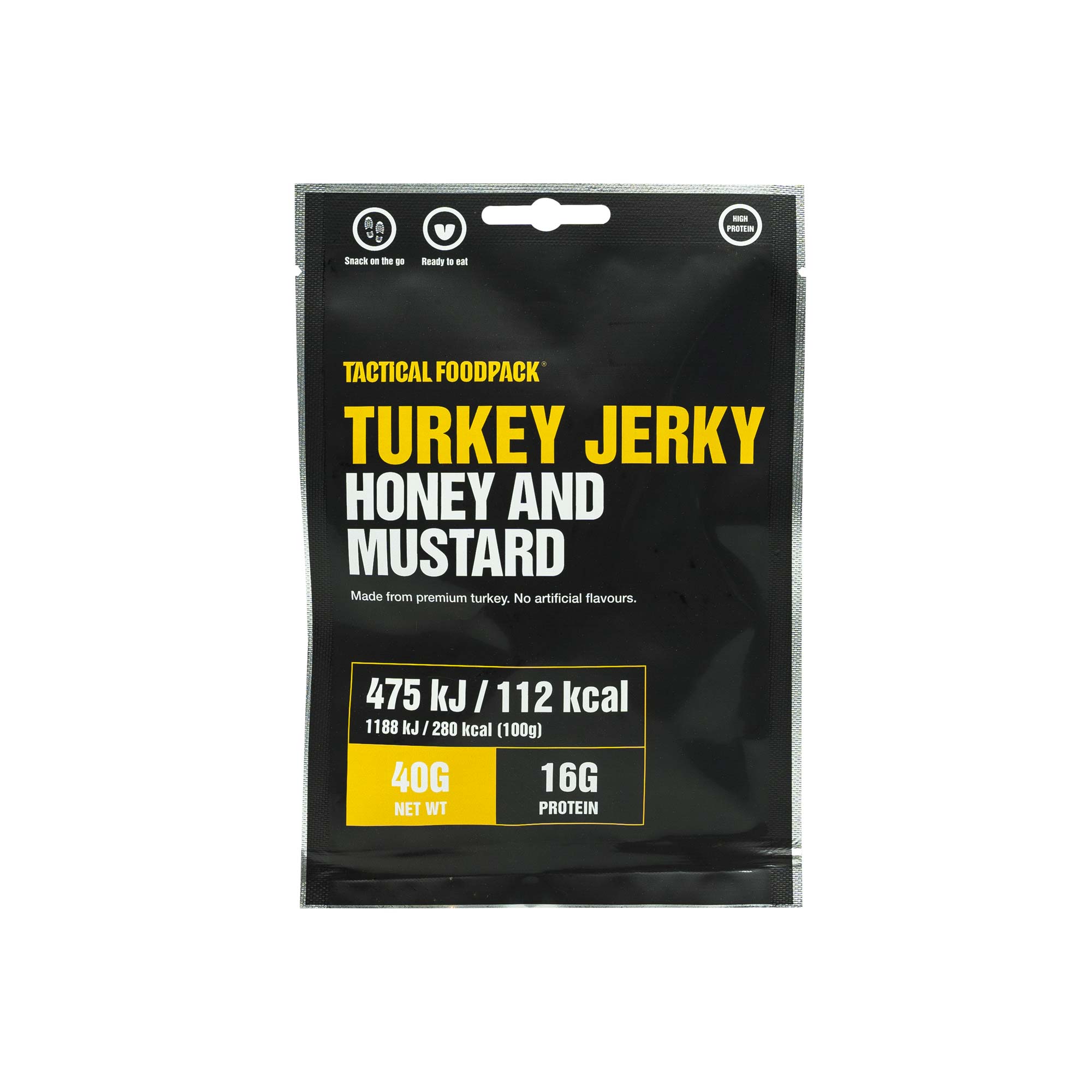 The Turkey Jerky Honey & Mustard from Tactical Foodpack combines tender turkey breast with an aromatic honey-mustard-onion marinade. The meat is then gently air-dried to lock in all the natural flavor while remaining nutritious. Made from 69.7 % high-quality turkey breast, refined with real honey (4.6 %), onions, soy sauce, wine vinegar, mustard, garlic and spicy red wine flavors. Without artificial additives, but with an intense, addictive taste. With 112 kcal and 15.5 g protein per portion (40 g), it is an ideal, protein-rich snack for outdoors, sport, travel or as a healthy snack between meals. The packaging is light, practical and the snack has a shelf life of up to 3 years – perfect for long trips and store cupboards.