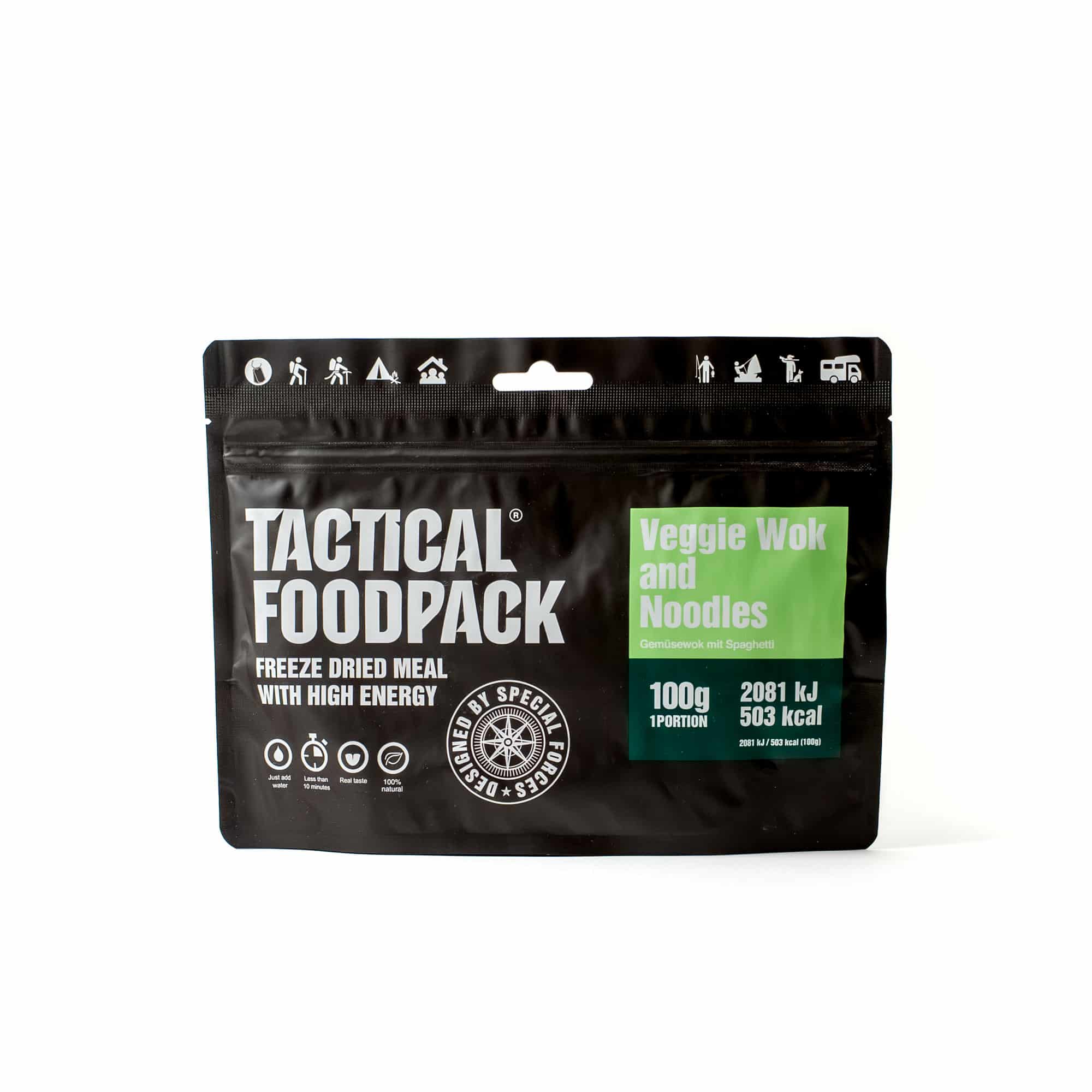 „Veggie Wok and Noodles“ (Gemüsewok mit Spaghetti) ist ein vollwertiges, veganes Nudelgericht mit aromatischem Wokgemüse, ideal für Outdoor-Aktivitäten, Krisenvorsorge oder als schnelle, nahrhafte Mahlzeit im Alltag. Das Trockenprodukt wiegt 100 g und ergibt durch Zugabe von 300 ml heißem Wasser eine fertige Portion von rund 400 g. In nur acht Minuten – bei Verwendung von kaltem Wasser etwa vierzehn Minuten – entsteht ein geschmackvolles Gericht mit 551 kcal. Die Zutaten sind rein pflanzlich und naturbelassen: Spaghetti (42 %), Paprika, Karotten, grüne Bohnen, Tomaten, Zwiebeln, Oliven, Knoblauch, Kräuter und Rapsöl. Es enthält keine Konservierungsstoffe und hat eine lange Haltbarkeit bis mindestens Februar 2030 – perfekt geeignet für den Notvorrat, Reisen oder Abenteuer unter freiem Himmel.