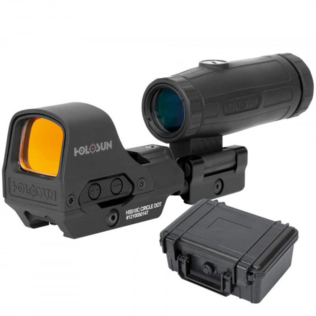 Das Holosun HS510C Solar Red Circle Dot Sight Combo mit HM3X ist eine modulare Zieloptik, die einen offenen Reflex-Red-Dot-Kolimator (HS510C Solar) mit integriertem Solar-Fail-Safe und eine 3-fach-Magnifikation (HM3X) kombiniert. Der HS510C bietet ein 2-MOA-Kippenpunkt innerhalb eines 65-MOA-Rings, sechs Tag- und zwei Nachtvisierhelligkeiten sowie die Shake-Awake-Technologie für automatische Aktivierung bei Bewegung. Die Solarzelle verlängert die Batterielebensdauer und sorgt für dauerhaft gleichmäßige Helligkeit. Der HM3X-Magnifier lässt sich bei Nichtgebrauch seitlich wegklappen und erweitert das Sichtfeld auf mittlere Distanzen (bis etwa 300 m). Montagemöglichkeiten bestehen auf Weaver- oder Picatinny-Schienen, ideal für AR-15-Varianten, HK MP5, SIG Sauer MPX oder Glock-Adapter für Pistolen. Das stoßfeste, wasserdichte Gehäuse ist staub- und beschlagfrei. Mit rund 400 g Gesamtgewicht ist die Combo robust und lässt sich sowohl für schnelle Zielerfassung als auch präzises Schießen einsetzen.